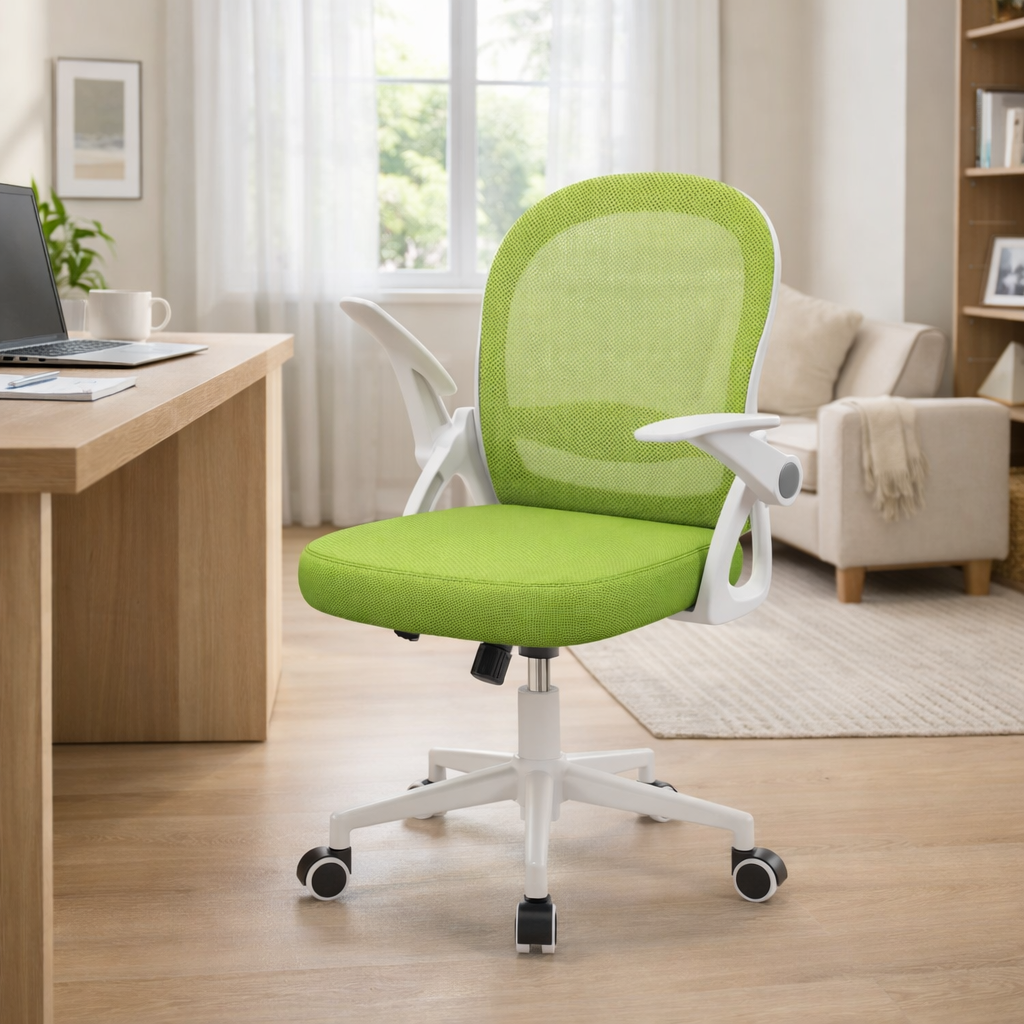 Chaise de bureau en maille avec dossier moyen de 45 cm et assise en mousse recouverte de maille synthétique. La hauteur du siège est réglable de 43 à 53 cm, les accoudoirs sont rabattables et la chaise repose sur une base métallique avec roulettes multidirectionnelles. Le produit est livré démonté avec kit de montage et manuel d’instructions.